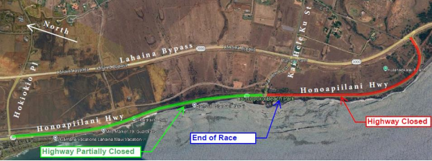 The southbound lane on Honoapi‘ilani Highway between Hōkiokio Place and Kai Hele Kū Street near Launiupoko Beach Park will be closed during the race to reduce traffic and allow for runners for the 5K run.