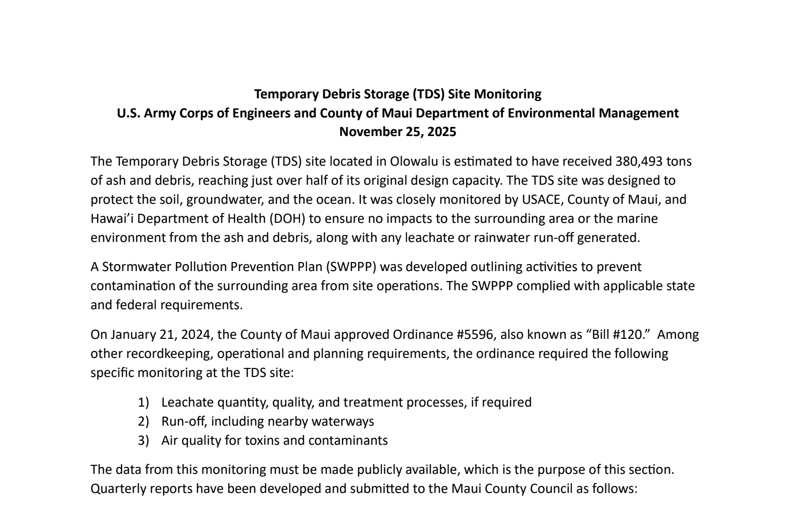 The Temporary Debris Storage (TDS) area located in Olowalu was designed as the most robust temporary site ever constructed by a federal agency. It is underlain by a thick (80 mil or 0.08 inches) plastic impermeable liner to protect the soil, groundwater, and ocean. As required by Bill 120 (Ordinance #5596) the entire TDS site is being monitored closely by USACE to ensure no impacts to the surrounding area or the marine environment from either the ash and debris, along with any leachate or rainwater run-off generated. The Bill requires sampling and monitoring data related to leachate, run-off and air quality to be reported and made public every 90 days. The first and second reports on this data were posted below. Please stay tuned to this space for updates as they are available. For more information on what is being monitored please see Bill 120 and the informational document.