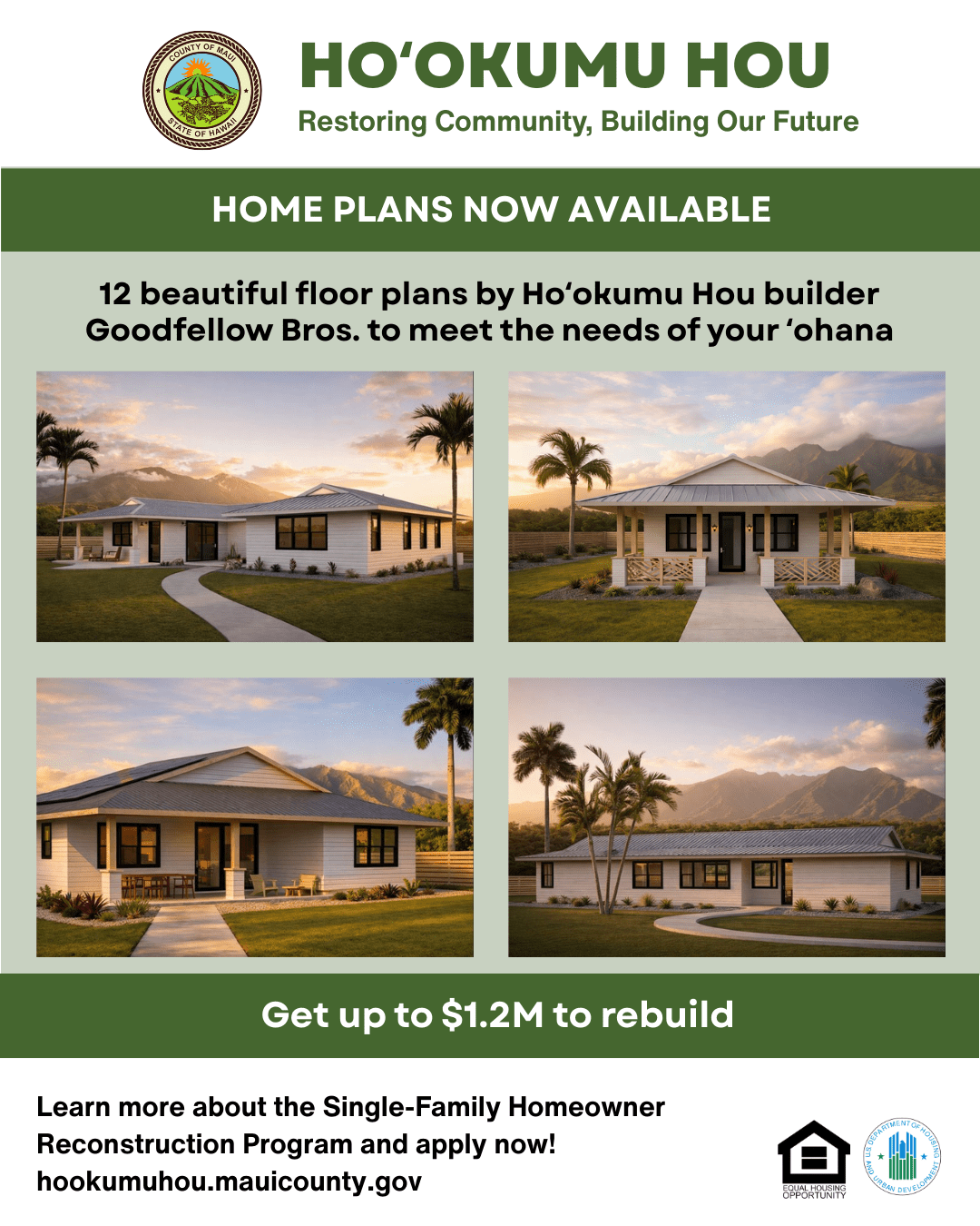 Interested homeowners can view the floor plans and apply for the Single-Family Homeowner Reconstruction Program at http://hookumuhou.mauicounty.gov/, or visit the resource centers in Kahului and Lahaina. The deadline to apply for this program, as well as the Single-Family Homeowner Reimbursement Program, have been extended to Aug. 31, 2026.